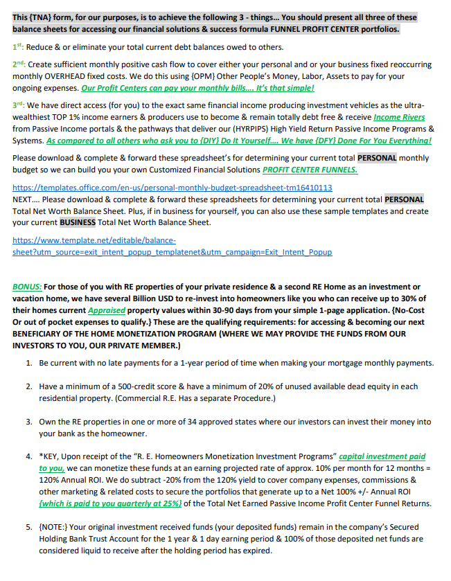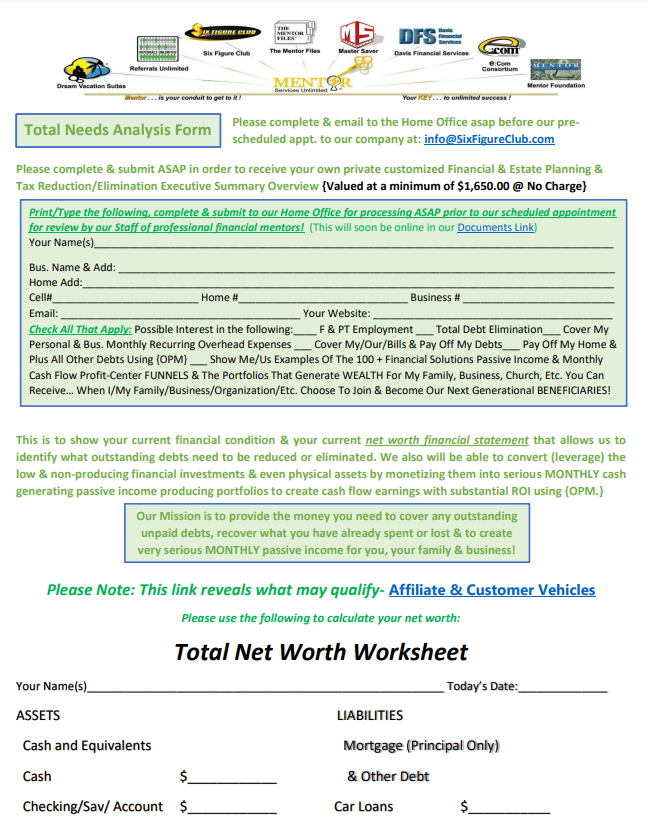 Please complete & submit ASAP in order to receive your own private customized Financial & Estate Planning & Tax Reduction/Elimination Executive Summary Overview {Valued at a minimum of $1,650.00 @ No Charge}